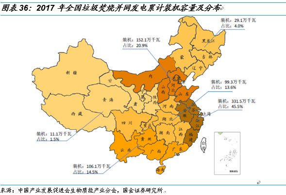 2017年底,我國(guó)垃圾焚燒累計(jì)并網(wǎng)發(fā)電裝機(jī)容量達(dá)到725.1萬千瓦,約占全國(guó)生物質(zhì)并網(wǎng)發(fā)電總裝機(jī)容量的49%。隨著我國(guó)城鎮(zhèn)化建設(shè)進(jìn)一步深入,垃圾焚燒發(fā)電項(xiàng)目開發(fā)建設(shè)重點(diǎn)已經(jīng)逐步由大中型城市向新興城鎮(zhèn)轉(zhuǎn)移,“十三五”期間的垃圾焚燒發(fā)電將是生物質(zhì)發(fā)電產(chǎn)業(yè)中的主要增長(zhǎng)點(diǎn)。我國(guó)的垃圾焚燒發(fā)電項(xiàng)目主要集中在華東和華北地區(qū),尤以經(jīng)濟(jì)相對(duì)發(fā)達(dá)的華東地區(qū)的發(fā)展規(guī)模最大,在全國(guó)垃圾焚燒發(fā)電裝機(jī)容量中的占比接近一半。目前,垃圾焚燒發(fā)電累計(jì)裝機(jī)容量占全國(guó)比例最高的四個(gè)地區(qū)分別為:江蘇、廣東、浙江和山東,垃圾焚燒發(fā)電項(xiàng)目的建設(shè)與地區(qū)經(jīng)濟(jì)的發(fā)展密切相關(guān)。