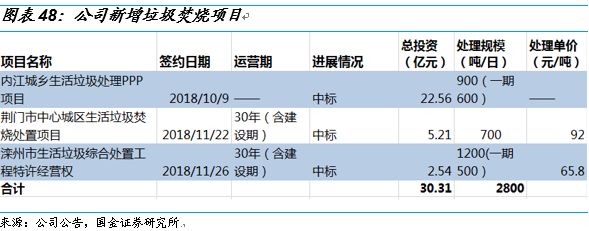 固廢處理在手項(xiàng)目充足,未來業(yè)績(jī)?cè)鲩L(zhǎng)有保障。公司固廢處理業(yè)務(wù)板塊已經(jīng)投運(yùn)產(chǎn)能11300噸/日,在建及籌建產(chǎn)能約為16000噸/日,在手項(xiàng)目充足,未來產(chǎn)能還有翻倍的空間。我們預(yù)計(jì)2019年將投產(chǎn)3700噸/日,2020年將投產(chǎn)3000噸/日以上。11月21日,公司以3.7億元收購(gòu)贛州宏華環(huán)保有限責(zé)任公司100%股權(quán),并投資贛州信豐工業(yè)固體廢物處置中心項(xiàng)目。信豐項(xiàng)目危險(xiǎn)廢物處置規(guī)模為7.2萬噸/年,其中填埋4.8萬噸/年、焚燒1.5萬噸/年、物化處理0.2萬噸/年、廢鋼制包裝桶回收0.7萬噸/年,安全填埋場(chǎng)總庫(kù)容95萬m³,預(yù)計(jì)于18年12月底正式投入運(yùn)營(yíng)。公司原有危廢處置項(xiàng)目為佛山市南海區(qū)項(xiàng)目(9.3萬噸/年),目前在建中。通過收購(gòu)宏華環(huán)保100%股權(quán),公司危廢處置規(guī)模達(dá)到16.5萬噸。此次收購(gòu)有利于實(shí)現(xiàn)公司的危廢業(yè)務(wù)戰(zhàn)略布局,符合公司戰(zhàn)略投資方向和業(yè)務(wù)發(fā)展規(guī)劃,將為公司創(chuàng)造新的利潤(rùn)增長(zhǎng)點(diǎn)。