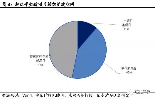 全新項(xiàng)目中,單體項(xiàng)目111個(gè),占比47%;剩余124個(gè)項(xiàng)目已預(yù)留二期(三期)擴(kuò)建場地或?yàn)槎冢ㄈ冢U(kuò)建項(xiàng)目,側(cè)面反映項(xiàng)目方已考慮到未來新增處置需求的增長。