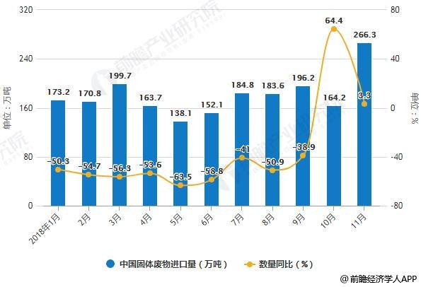 據(jù)前瞻產(chǎn)業(yè)研究院發(fā)布的《中國固廢處理行業(yè)市場前瞻與投資戰(zhàn)略規(guī)劃分析報(bào)告》統(tǒng)計(jì)數(shù)據(jù)顯示,2018年11月中國固體廢物進(jìn)口量大幅度增長,2018年11月中國固體廢物進(jìn)口量為226.3萬噸,同比增長3.3%。