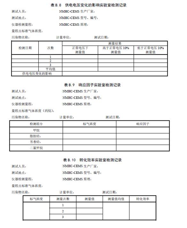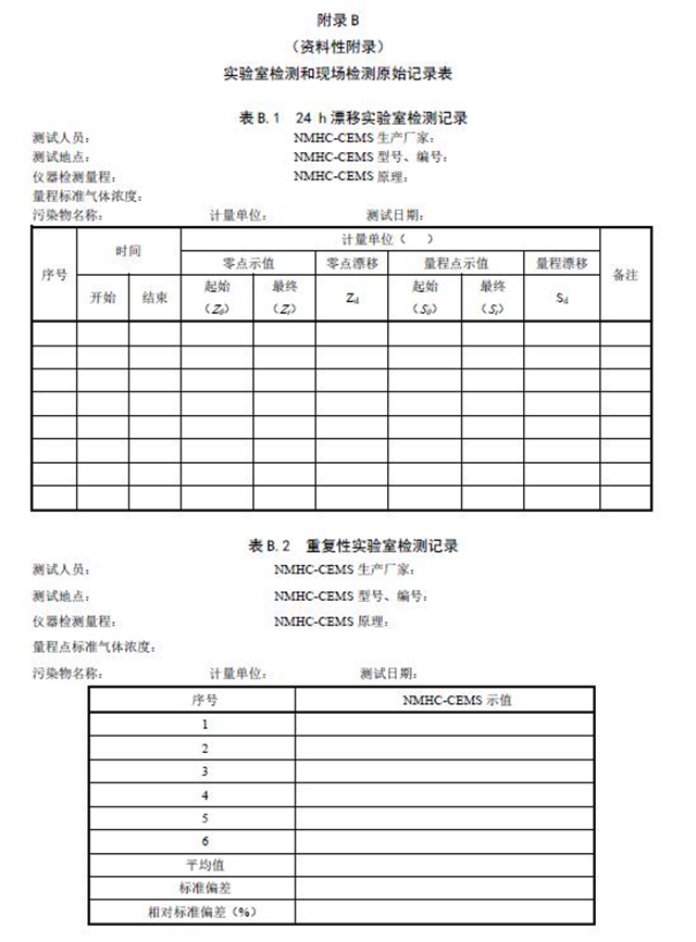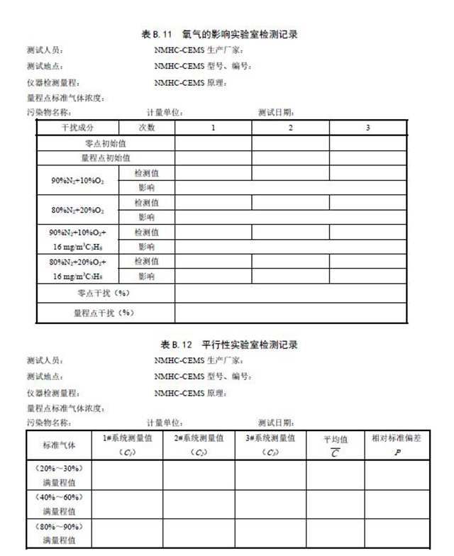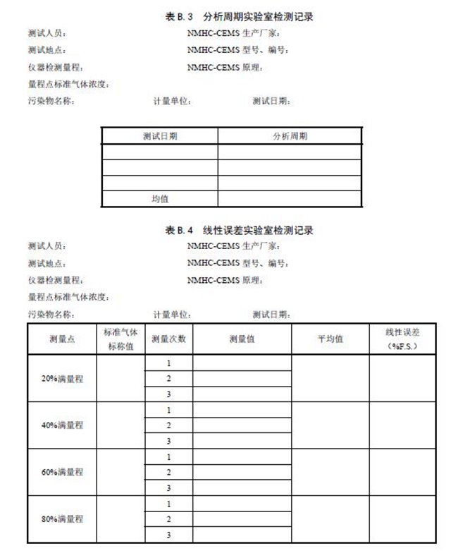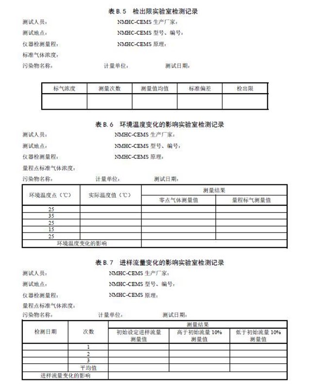 固定污染源廢氣NMHC-CEMS 實(shí)驗(yàn)室檢測(cè)項(xiàng)目見(jiàn)表3 和表4,廢氣參數(shù)現(xiàn)場(chǎng)檢測(cè)項(xiàng)目見(jiàn)表5。相關(guān)記錄表格見(jiàn)附錄B。