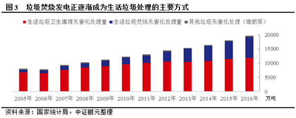 垃圾焚燒發(fā)電具有其他垃圾處理方式無法比擬的優(yōu)勢(shì),其處理規(guī)模上升較快。生活垃圾處理大致分為衛(wèi)生填埋、焚燒和堆肥等方式,前兩種方式為主。從全國來看,衛(wèi)生填埋目前是生活垃圾無害化處理的主流方式,2016年占比60.32%,但垃圾焚燒符合“垃圾處理十三五規(guī)劃”中的“減量化、無害化、資源化”三原則,垃圾焚燒后,一般體積可減少90%以上,重量減輕80%以上。垃圾焚燒后再填埋,可以有效地減少對(duì)土地資源的占用。高溫焚燒后可消除垃圾中大量有害病菌、有毒物質(zhì)和惡臭氣體,同時(shí)垃圾滲濾液可以高溫分解,避免污染地下水。垃圾焚燒后產(chǎn)生的熱能可用于發(fā)電供熱,燃燒后的廢渣可以用于建筑材料生產(chǎn),實(shí)現(xiàn)資源的綜合利用。