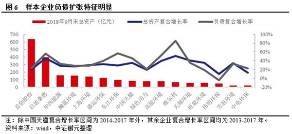 樣本企業(yè)總資產(chǎn)規(guī)模差異較大,負(fù)債帶動(dòng)資產(chǎn)擴(kuò)張?zhí)卣髅黠@。從2018年9月末資產(chǎn)規(guī)模來看,首創(chuàng)股份居首,啟迪桑德位于第二,均超過350億元,100-200億元的企業(yè)有4家,100億元以下企業(yè)10家。生活垃圾焚燒發(fā)電領(lǐng)域市場(chǎng)空間大,國家支持力度強(qiáng),項(xiàng)目運(yùn)營期經(jīng)濟(jì)效益穩(wěn)定,在PPP政策的推動(dòng)下,業(yè)內(nèi)企業(yè)積極通過投資、并購占領(lǐng)市場(chǎng),2013-2017年樣本企業(yè)總資產(chǎn)復(fù)合增速29.83%,16家樣本企業(yè)中有11家負(fù)債年復(fù)合增速超過總資產(chǎn)復(fù)合增速。