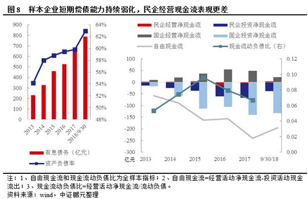 民營企業(yè)經(jīng)營現(xiàn)金流表現(xiàn)較差,投資活動(dòng)對(duì)債務(wù)資金依賴性更高,再融資收縮對(duì)民企影響更大。樣本企業(yè)2016年以來經(jīng)營現(xiàn)金流表現(xiàn)不佳,自由現(xiàn)金流缺口不斷增加,現(xiàn)金流動(dòng)負(fù)債比持續(xù)走低,短期償債能力弱化。相比之下,民營企業(yè)經(jīng)營凈現(xiàn)金流表現(xiàn)更差,投資活動(dòng)對(duì)外部籌資依賴性很高。受銀行信貸、非標(biāo)融資渠道收緊以及債市遇冷等外部因素影響,2018年前三季度民企籌資活動(dòng)凈現(xiàn)金流僅為9.08億元,而2017年全年為68.41億元,外部融資急劇收縮,導(dǎo)致民企信用風(fēng)險(xiǎn)逐漸暴露。