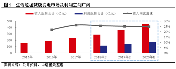 根據(jù)垃圾處理“十三五”規(guī)劃,到2020年底,設(shè)市城市生活垃圾焚燒處理能力占無害化處理總能力的50%以上,其中東部地區(qū)達(dá)到60%以上。生活垃圾清運(yùn)量上升及垃圾焚燒發(fā)電處理方式占比提升均可為行業(yè)增長提供支撐。以2016年生活垃圾焚燒無害化日處理能力25.59萬噸/日為基數(shù),按產(chǎn)能利用率80%,垃圾處理單價(jià)50元/噸,噸上網(wǎng)發(fā)電量280度,上網(wǎng)電價(jià)0.65元/度,單位產(chǎn)能投資額46萬元/萬噸/日,運(yùn)營、設(shè)備制造及安裝、PPP工程業(yè)務(wù)利潤率分別為40%、35%、30%測(cè)算,中證鵬元預(yù)測(cè)2018-2020年生活垃圾焚燒發(fā)電行業(yè)市場(chǎng)空間分別為289.11億元、361.92億元和451.69億元,增速分別為25.67%、25.18%和24.80%,利潤空間分別為113.94億元、142.30億元和177.27億元。