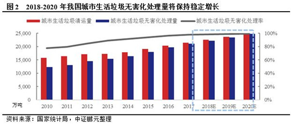 我國生活垃圾處理市場(chǎng)規(guī)模將保持增長。《“十三五”全國城鎮(zhèn)生活垃圾無害化處理設(shè)施建設(shè)規(guī)劃》(以下簡(jiǎn)稱“垃圾處理十三五規(guī)劃”)指出,“十三五”期間全國規(guī)劃新增生活垃圾無害化處理能力50.97萬噸/日(包含“十二五”續(xù)建12.9萬噸/日),全國城鎮(zhèn)生活垃圾無害化處理設(shè)施建設(shè)總投資約2,518.4 億元。到2020年底,直轄市、計(jì)劃單列市和省會(huì)城市(建成區(qū))生活垃圾無害化處理率達(dá)到100%,其他設(shè)市城市、縣城(建成區(qū))、建制鎮(zhèn)生活垃圾無害化處理率分別達(dá)到95%、80%、70%以上。中證鵬元以2017年城市生活垃圾無害化處理率97.74%和城市生活垃圾清運(yùn)量增速5.69%為基準(zhǔn),假定無害化處理率每年上升0.06個(gè)百分點(diǎn),未來每年城市生活垃圾清運(yùn)量增速為5%(考慮經(jīng)濟(jì)下行壓力,保守估計(jì)),測(cè)算2018-2020年我國城市生活垃圾無害化處理量分別為2.22億噸、2.35億噸和2.48億噸。根據(jù)2018年9月中共中央、國務(wù)院印發(fā)的《鄉(xiāng)村振興戰(zhàn)略規(guī)劃(2018-2022年)》要求,推進(jìn)農(nóng)村生活垃圾治理、農(nóng)村污水處理、實(shí)施廁所革命、消除農(nóng)村黑臭水體、提升村容村貌是補(bǔ)齊突出短板的重要內(nèi)容。鄉(xiāng)村振興戰(zhàn)略作為2017年及2018年中央經(jīng)濟(jì)工作會(huì)議部署的重點(diǎn)工作,正逐步得到實(shí)施。隨著農(nóng)村未處理垃圾存量的消化和處理范圍擴(kuò)大,未來農(nóng)村垃圾處理規(guī)模有較大增長空間。