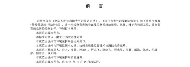 為貫徹落實(shí)國(guó)務(wù)院《打贏藍(lán)天保衛(wèi)戰(zhàn)三年行動(dòng)計(jì)劃》和《杭州市“清潔排放區(qū)”建設(shè)暨大氣污染防治2018年實(shí)施計(jì)劃》加強(qiáng)揚(yáng)塵監(jiān)管,安裝在線監(jiān)測(cè)和視頻監(jiān)控設(shè)備的工作要求,規(guī)范我市揚(yáng)塵在線監(jiān)測(cè)系統(tǒng)的建設(shè)、維護(hù)和管理工作,進(jìn)一步提高我市揚(yáng)塵污染防治水平。杭州市環(huán)境監(jiān)測(cè)中心站和杭州市質(zhì)量技術(shù)監(jiān)督檢測(cè)院經(jīng)過(guò)廣泛調(diào)研,結(jié)合我市實(shí)際,編制完成了《杭州市揚(yáng)塵在線監(jiān)測(cè)系統(tǒng)技術(shù)規(guī)范(試行)》,并在征求相關(guān)部門意見的基礎(chǔ)上,已進(jìn)行修改完善,現(xiàn)予以發(fā)布。