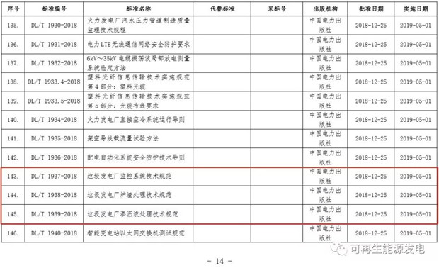 2018年12月25日,國家能源局發(fā)布2018年第16號(hào)公告,批準(zhǔn)了204項(xiàng)行業(yè)標(biāo)準(zhǔn),并予以發(fā)布。其中由中國電力企業(yè)聯(lián)合會(huì)垃圾發(fā)電標(biāo)準(zhǔn)化技術(shù)委員會(huì)提出并組織編制的第二批三項(xiàng)電力行業(yè)標(biāo)準(zhǔn)《垃圾發(fā)電廠監(jiān)控系統(tǒng)技術(shù)規(guī)范》(DL/T 1937-2018)、《垃圾發(fā)電廠爐渣處理技術(shù)規(guī)范》(DL/T1938-2018)、《垃圾發(fā)電廠滲瀝液處理技術(shù)規(guī)范》(DL/T 1939-2018),將于2019年5月1日起正式實(shí)施。