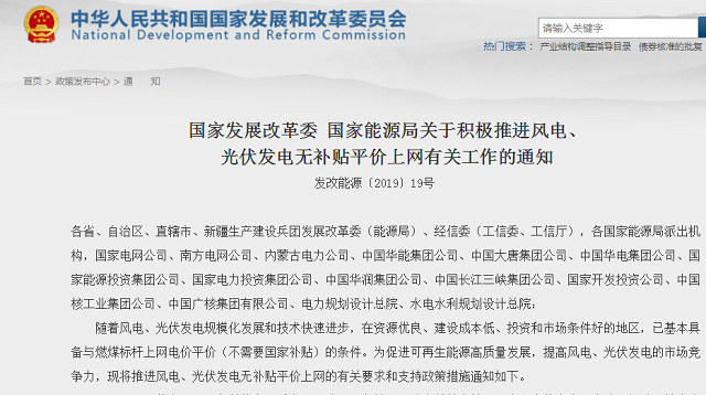 隨著風電、光伏發(fā)電規(guī)模化發(fā)展和技術快速進步,在資源優(yōu)良、建設成本低、投資和市場條件好的地區(qū),已基本具備與燃煤標桿上網(wǎng)電價平價(不需要國家補貼)的條件。為促進可再生能源高質量發(fā)展,提高風電、光伏發(fā)電的市場競爭力,現(xiàn)將推進風電、光伏發(fā)電無補貼平價上網(wǎng)的有關要求和支持政策措施通知如下。