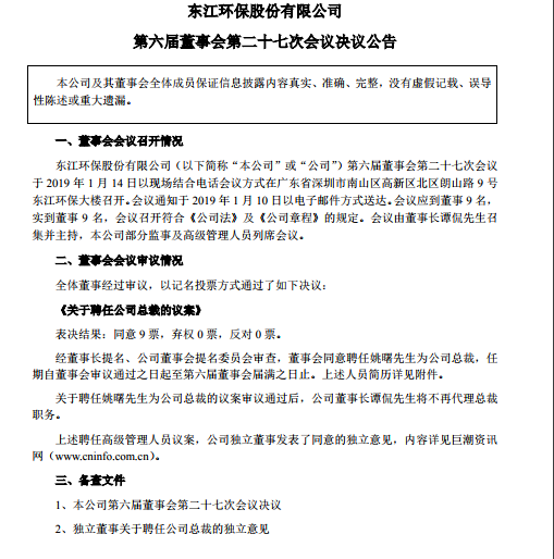 東江環(huán)保董事會同意聘任姚曙為公司總裁