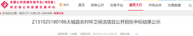 2019年1月14日,河北省大城縣農(nóng)村環(huán)衛(wèi)保潔項目發(fā)布中標結(jié)果公示,啟迪桑德環(huán)境資源股份有限公司獲得二標段,中標金額為2254.93萬/年,服務(wù)期限為3年。