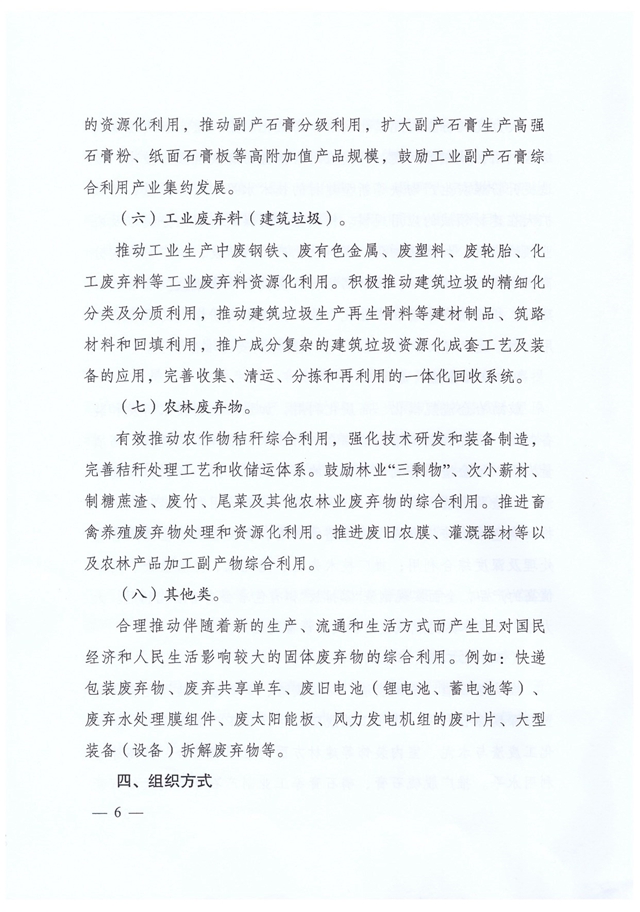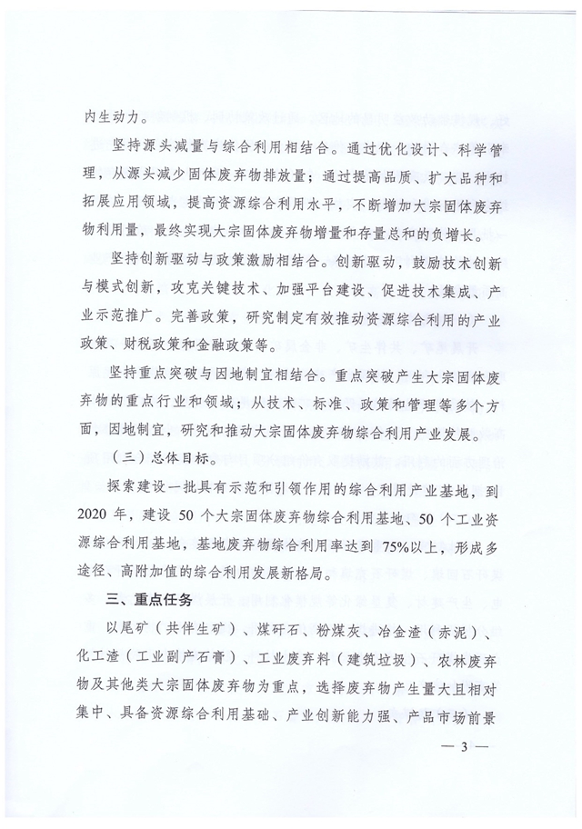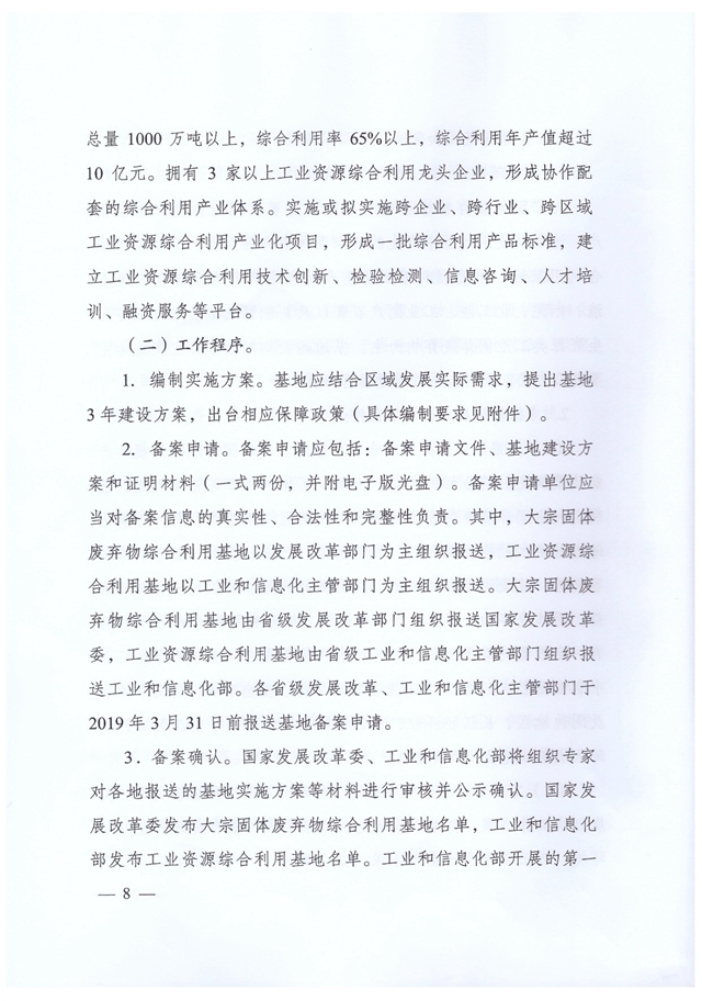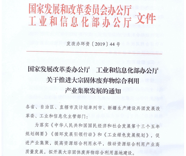 為落實(shí)《中華人民共和國(guó)經(jīng)濟(jì)和社會(huì)發(fā)展第十三個(gè)五年規(guī)劃綱要》《循環(huán)發(fā)展引領(lǐng)計(jì)劃》和《工業(yè)綠色發(fā)展規(guī)劃》,促進(jìn)產(chǎn)業(yè)集聚,提高資源綜合利用水平,推動(dòng)資源綜合利用產(chǎn)業(yè)高質(zhì)量發(fā)展,近日,國(guó)家發(fā)展改革委辦公廳和工業(yè)和信息化部辦公廳印發(fā)了關(guān)于推進(jìn)大宗固體廢棄物綜合利用產(chǎn)業(yè)集聚發(fā)展的通知。