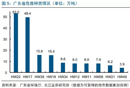 廣東省危廢種類中前5位的HW08(含油污泥,96.8萬噸,占總資質(zhì)的20%)/HW22(含銅廢物,76.7萬噸,占總資質(zhì)的15%)/HW17(表面處理污泥,56.3萬噸,占總資質(zhì)的11%)/HW49(其他廢物,50.2萬噸,占總資質(zhì)的10%)/HW48(有色金屬冶煉廢物,26.6萬噸,占總資質(zhì)的5%)合計占總資質(zhì)61%,危廢資質(zhì)種類集中度高。