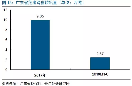 2017年廣東省跨省轉(zhuǎn)出危廢量9.85萬噸(占廣東省產(chǎn)危量的4.2%),2018年前6個月跨省轉(zhuǎn)出2.37萬噸。從接受省份來看,湖南、安徽、江西占比較高,三省合計接收廣東危廢6.76萬噸,占廣東轉(zhuǎn)出危廢量的68.6%。