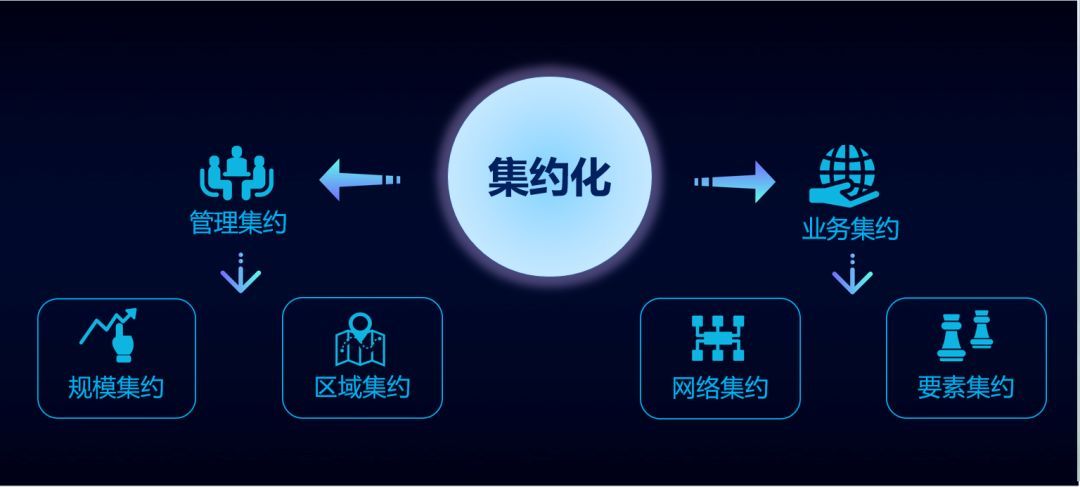 為了深入分析如何達(dá)成提高運(yùn)營長期效率這個(gè)目標(biāo),E20研究院將其集約化類型劃分為兩大類,四小類進(jìn)行解析。分別是管理集約型,包括區(qū)域集約型和規(guī)模集約型兩類;業(yè)務(wù)集約型,包括網(wǎng)絡(luò)集約型和要素集約型兩類??傮w來講,集約化的核心就是集中管理,提高效率。