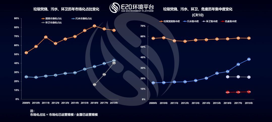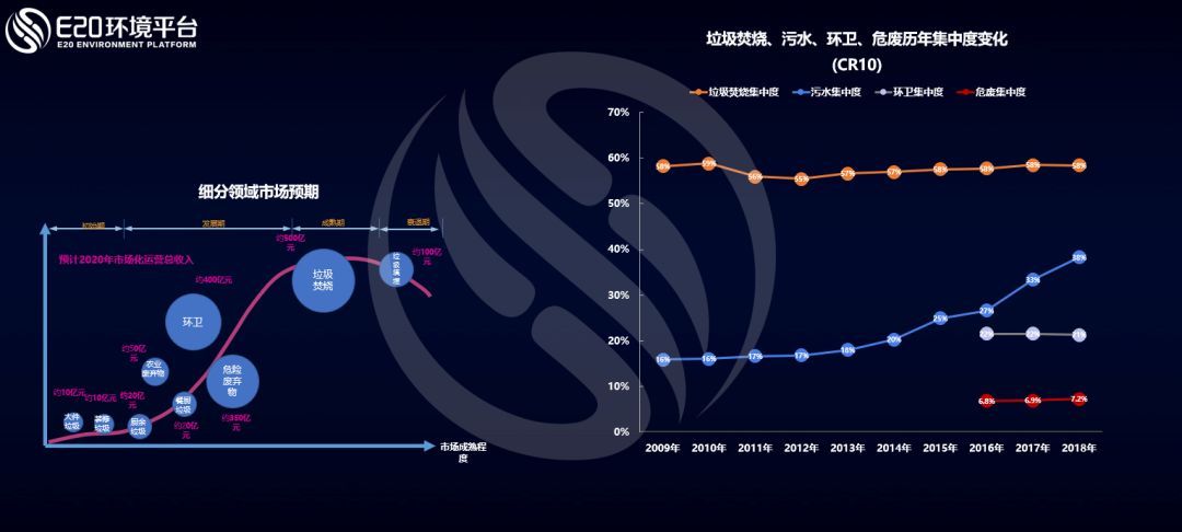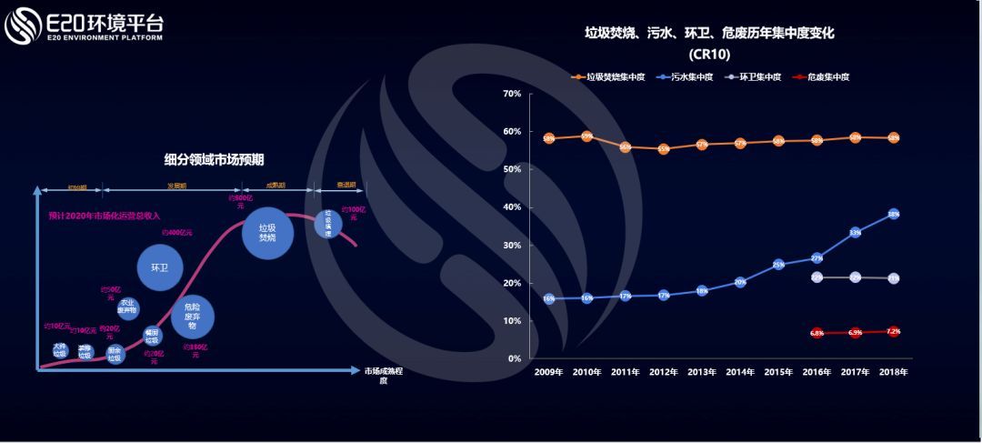 而通過E20研究院數(shù)據(jù)中心對(duì)各細(xì)分領(lǐng)域龍頭企業(yè)的跟蹤調(diào)研發(fā)現(xiàn),我國生活垃圾焚燒領(lǐng)域市場(chǎng)集中度CR10(前十家企業(yè)的市場(chǎng)占有率之和)近10年來穩(wěn)定在58%左右;污水處理行業(yè)集中度CR10持續(xù)增長,至2018年達(dá)到38%左右;環(huán)衛(wèi)行業(yè)和危廢行業(yè)的市場(chǎng)集中度CR10均基本穩(wěn)定,分別保持在20%和7%左右,市場(chǎng)仍較分散,這個(gè)原因是市場(chǎng)釋放非常快,新進(jìn)入者眾多,仍處于行業(yè)的快速上升期。