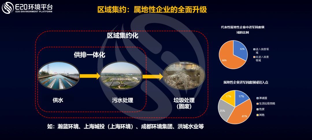 區(qū)域集約指同區(qū)域內(nèi)的管理集約,包括同要素和不同要素集約,主要實(shí)施主體是區(qū)域性環(huán)境綜合服務(wù)商(E20環(huán)境產(chǎn)業(yè)B方陣等),其屬地性、區(qū)域性強(qiáng),企業(yè)一般由當(dāng)?shù)貒Y委控股,不通過競(jìng)爭性招標(biāo)直接承接區(qū)域內(nèi)項(xiàng)目。區(qū)域集約主要是屬地型企業(yè)的全面升級(jí),這些企業(yè)往往從供水開始,逐步進(jìn)入污水處理,再進(jìn)入垃圾處理行業(yè)。