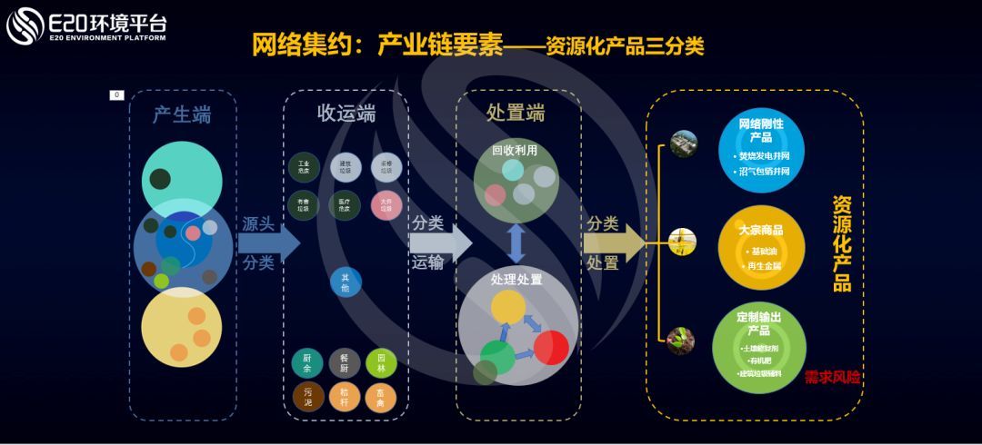 上圖對(duì)城市各種固廢的網(wǎng)絡(luò)集約進(jìn)行了總結(jié),其中廢物實(shí)現(xiàn)資源化的模式我們進(jìn)行了分類,可分為網(wǎng)絡(luò)剛性產(chǎn)品、大宗產(chǎn)品以及定制輸出產(chǎn)品。網(wǎng)絡(luò)剛性產(chǎn)品包括焚燒發(fā)電并網(wǎng),沼氣包銷并網(wǎng);大宗產(chǎn)品包括基礎(chǔ)油,再生金屬等;定制輸出產(chǎn)品包括土壤修復(fù)劑,有機(jī)肥,建筑垃圾輔料等。其中,對(duì)于網(wǎng)絡(luò)剛性產(chǎn)品和大宗產(chǎn)品,都不太用考慮后端消納的痛點(diǎn)(即不需要面對(duì)資源化產(chǎn)品銷售的需求風(fēng)險(xiǎn)),然而定制輸出類產(chǎn)品則在這個(gè)方面成為痛點(diǎn),也是屬于網(wǎng)絡(luò)集約所提供的可持續(xù)開發(fā)和差異化競(jìng)爭的市場(chǎng)機(jī)會(huì)。