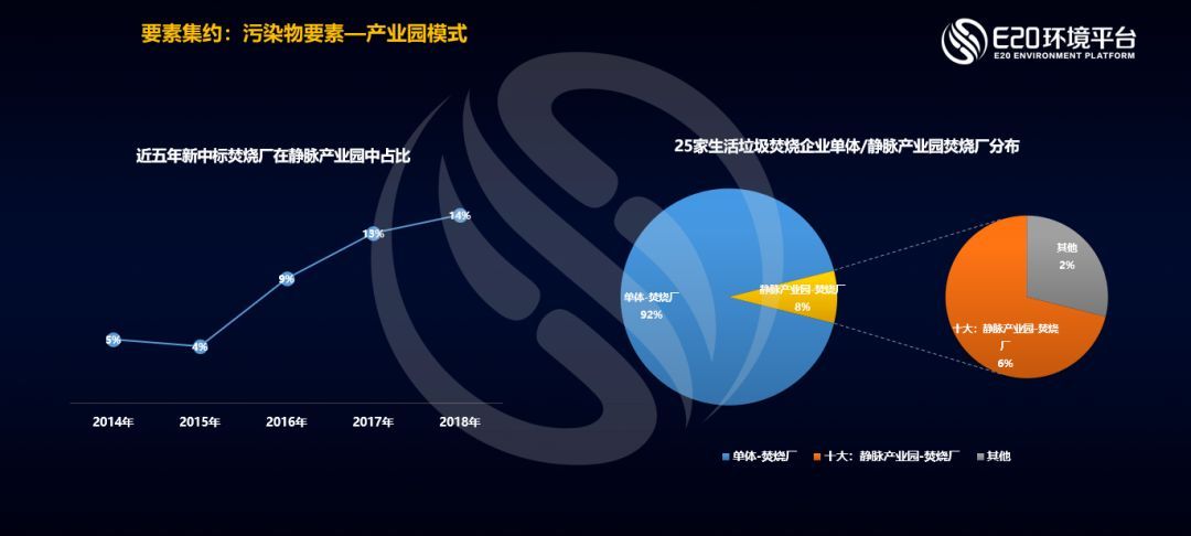 通過近幾年的數(shù)據(jù)觀察,我們發(fā)現(xiàn)新中標(biāo)焚燒廠在靜脈產(chǎn)業(yè)園中的占比正在逐漸提升,2018年已達(dá)14%。目前,垃圾焚燒十大影響力企業(yè)在靜脈產(chǎn)業(yè)園中的焚燒廠占比已達(dá)6%。同時(shí),我們還觀察到循環(huán)經(jīng)濟(jì)產(chǎn)業(yè)園模式已成為新進(jìn)入的實(shí)力強(qiáng)勁的非垃圾焚燒影響力企業(yè)(如盈峰、雅居樂)在固廢處理行業(yè)激烈競(jìng)爭中彎道超車的一種打法。