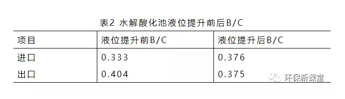 結(jié)合表2水解酸化池出水后B/C有一定的提高,在水解酸化池液位為提升前B/C由0.333提高到0.404,當(dāng)水解池液位提升后(停留時(shí)間增加0.2h)B/C由0.376降到0.375左右,說(shuō)明停留時(shí)間增長(zhǎng),水解酸化池中消耗BOD5的微生物數(shù)量增多,反應(yīng)器向厭氧反應(yīng)的第三個(gè)階段進(jìn)行,對(duì)于后續(xù)的生化處理產(chǎn)生不良影響。