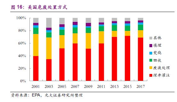 (2)第三方處理比例較低。在1990 年后,政府對危廢的監(jiān)管進(jìn)一步趨嚴(yán),單純的通過第三方處置對于有大量危廢產(chǎn)出的企業(yè)來說成本過高,加上危廢處理技術(shù)的進(jìn)一步成熟,促使眾多大型化工企業(yè)采用自行處理危廢的方式消納危廢產(chǎn)出。從2001 年起,美國危廢的場外處理量(Waste received fromoff-Site,即接收從場外運(yùn)送進(jìn)處理廠內(nèi)的危廢,基本等同于第三方處置量)穩(wěn)定在15%到20%之間,在危廢產(chǎn)量基本穩(wěn)定的情況下,第三方處置危廢企業(yè)可以分到的蛋糕其實(shí)十分有限,這也激發(fā)了危廢處置企業(yè)開拓新業(yè)務(wù)的需求。