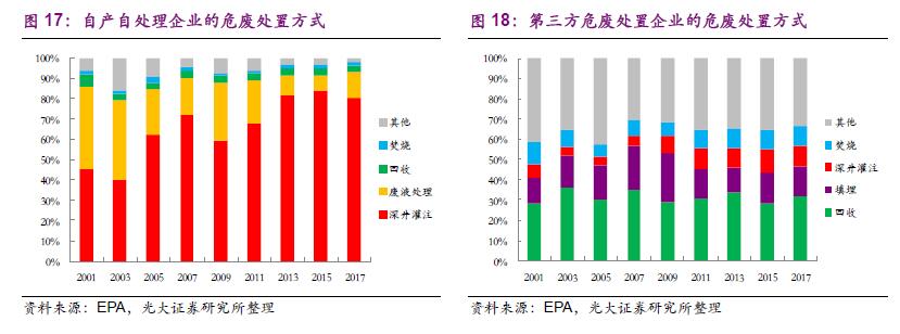 (3)危廢處置方式求同存異。整體來看,美國危廢處置方式的選擇已基本統(tǒng)一,深井灌注已成為美國危廢處置的主流方式,自2013 年深井灌注處置危廢量的占比穩(wěn)定在70%左右,廢液處理(僅適用于液費(fèi))、能量回收、焚燒、填埋位列2-5 位。但是另一方面,第三方處置和自產(chǎn)自處理的危廢處置方式有著較大的不同。石油、化工等大型企業(yè)多使用深井灌注處理自己產(chǎn)出的危廢(占比達(dá)80%以上),因其處置手段安全且成本相對較低;而第三方處置企業(yè)的主流處置方式則是回收利用(包括能量、金屬、溶劑等,占比近30%),填埋、焚燒、深井灌注等處置方式的占比均在10%左右。處置方式差異化的主要原因是自產(chǎn)自處理企業(yè)多為石油和化工企業(yè),危廢種類多為液費(fèi),深井灌注具有顯著的成本優(yōu)勢;而第三方處置企業(yè)接收的危廢種類更加多樣化,液費(fèi)占比也相對較低(30%左右),回收、焚燒、填埋等處置方式更符合其成本控制和利益獲取的要求,所以上述處置方式的占比更多。
