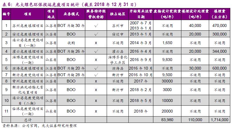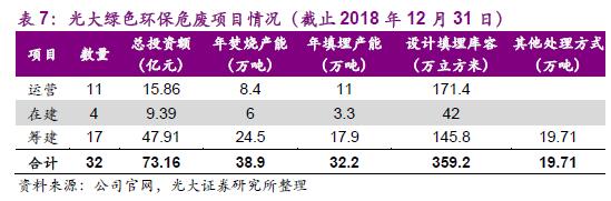 截止2018年12月31日,綠色環(huán)保共擁有58個(gè)生物質(zhì)綜合利用項(xiàng)目(運(yùn)營22個(gè)、在建14個(gè)、籌建13個(gè)、未啟動(dòng)二期項(xiàng)目9個(gè))、32個(gè)危廢綜合處理項(xiàng)目(運(yùn)營11個(gè)、在建4個(gè)、籌建17個(gè))、7個(gè)光伏發(fā)電項(xiàng)目和2個(gè)風(fēng)電項(xiàng)目(均已投運(yùn))、以及9個(gè)環(huán)境修復(fù)項(xiàng)目(運(yùn)營1個(gè)、在建7個(gè)、籌建1個(gè)),總投資共約240億元,年生活垃圾處理產(chǎn)能102萬噸,年危廢處理產(chǎn)能19.4萬噸(焚燒8.4、填埋11),年供熱量96萬噸。