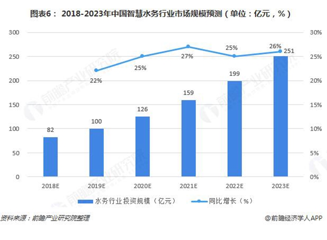 隨著水務(wù)投資規(guī)模的增加,智慧水務(wù)將迎來發(fā)展的黃金期。預(yù)計(jì)到2023年,中國(guó)智慧水務(wù)行業(yè)規(guī)模將達(dá)到251億元左右。