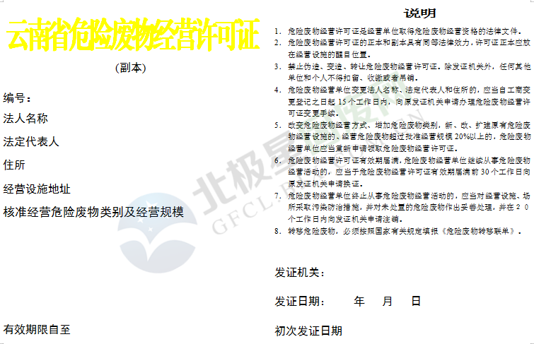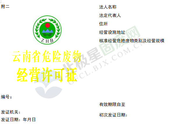 3.其他危險(xiǎn)廢物綜合經(jīng)營許可證,由云南省環(huán)境保護(hù)廳審批頒發(fā)。