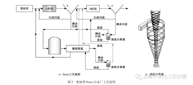 斯特拉斯污水處理廠以主流傳統(tǒng)工藝( AB法)與側(cè)流新型脫氮工藝( 厭氧氨氧化) 相結(jié)合的方式,運(yùn)行工藝如圖2a所示??芍? 污水經(jīng)過(guò)預(yù)處理進(jìn)入A段吸附( adsorption) 去除有機(jī)物,可有效防止過(guò)高的有機(jī)物對(duì)厭氧氨氧化菌的抑制。之后污水進(jìn)入B段生物降解過(guò)程( biodegradation) ,即采用一體式厭氧氨氧化工藝脫氮。在A段吸附了大量有機(jī)物的污泥,經(jīng)過(guò)排泥、剩余污泥濃縮、厭氧消化和脫水等過(guò)程后,產(chǎn)生的污泥厭氧消化液和污泥脫水液氨氮濃度較高,采用側(cè)流厭氧氨氧化DEMON工藝脫氮。側(cè)流部分通過(guò)旋流分離器( 圖2b) 分離絮體( 主要是AOB)和顆粒污泥( 主要AnAOB) ,從而富集厭氧氨氧化菌。在主流工藝中,除了傳統(tǒng)方式的污泥回流外,還需要回流測(cè)流工藝的污泥實(shí)現(xiàn)對(duì)AOB和AnAOB生物強(qiáng)化。除此之外,該工藝還將部分污泥消化液定期回流至B階段,進(jìn)行氨氮負(fù)荷的調(diào)控。