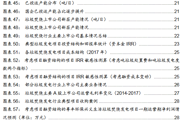 情景:考慮項目融資結(jié)構(gòu)的資本金IRR測算:我們假設(shè)項目的資本結(jié)構(gòu)為70%債務(wù),30%自有資金,參考中國天楹/綠色動力的公司財務(wù)狀況,假設(shè)其項目的債務(wù)資金的綜合成本分別為6.5%/5.6%,各個項目每年將新增部分財務(wù)費(fèi)用,我們計算得到各個項目慮融資杠桿后的IRR,其中最高的為綠色動力海寧項目IRR為30.0%,主因?yàn)槠鋰嵗l(fā)電量和噸投資額均為所列示可比項目最低。中國天楹延吉項目和康恒廣水項目IRR相對較低分別為17.1%/20.3%,主因其垃圾處置費(fèi)明顯較低,且中國天楹延吉項目噸垃圾發(fā)電量顯著低于其他項目。根據(jù)我們的敏感性分析,假設(shè)垃圾處置費(fèi)增加5元/噸,各個垃圾發(fā)電項目IRR增加0.6 pct -0.9pct;噸垃圾發(fā)電+20千瓦時/噸,各個項目的IRR增加.5pct ~2.3 pct。