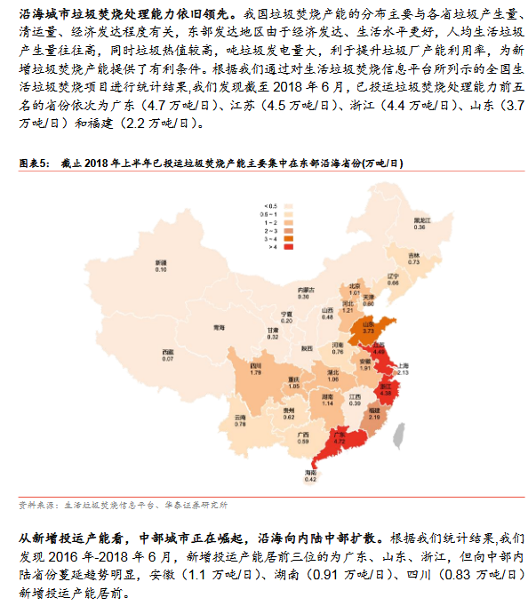 瀚藍(lán)環(huán)境的在手產(chǎn)能主要分布在福建省和廣東省,但在中部地區(qū)也已有一定規(guī)模的已投運(yùn)和在建/籌建項目;啟迪桑德的垃圾焚燒產(chǎn)能所覆蓋的省份數(shù)量僅次于光大國際,除了在山東省的5800噸/日的產(chǎn)能外,啟迪桑德目前大規(guī)模布局中西部和東北地區(qū)。