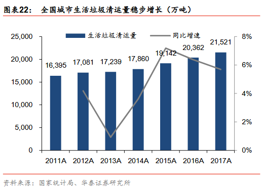 驅(qū)動因素一:需求的持續(xù)擴(kuò)張垃圾焚燒發(fā)電行業(yè)持續(xù)擴(kuò)張主要推動因素包括:1)垃圾產(chǎn)生量和清運(yùn)量持續(xù)提升:我國城市垃圾清運(yùn)量由2011年的1.64億噸上升到2017年的2.15億噸,年均復(fù)合增速4.6%,城鎮(zhèn)化的持續(xù)推進(jìn)、生活水平的逐步提高,我們認(rèn)為,城市垃圾產(chǎn)生量和清運(yùn)量仍將保持增長;2)垃圾焚燒占有率快速提升,垃圾焚燒占生活垃圾無害化處理量的比例從2011年的20%增長到2017年的40%。