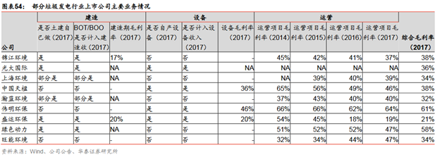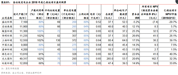 項目達(dá)產(chǎn)后主要收入來自發(fā)電收入,主要成本來自折舊、原材料和人工:首先假設(shè)該項目資金100%來自自有資金投資的情況下,則項目主要的收入、成本情況如下:1)收入:垃圾處置收入+發(fā)電收入。項目達(dá)產(chǎn)后,滿產(chǎn)狀態(tài)下可得出項目的年垃圾處理量,按照各個項目的垃圾處置費(fèi)(所列項目中最高為康恒寧波項目的149元/噸,最低為中國天楹延吉項目的58元/噸),則項目除增值稅后可測得年垃圾處置收入;按照0.65元/度的發(fā)電收入(部分項目比如康恒寧波項目、綠色動力永嘉、綠色動力海寧項目為0.66元/度),結(jié)合各項目噸垃圾發(fā)電量(所列項目中最高為綠色動力海寧項目的410度/噸,最低為中國天楹延吉項目的280度/噸),結(jié)合個項目的上網(wǎng)比例(79%-85%之間),可測得扣除增值稅后年垃圾發(fā)電收入;可以看出,噸垃圾處置費(fèi)和噸垃圾發(fā)電量是決定收入端的主要變量。2)成本:以中國天楹延吉項目為例,根據(jù)其非公開發(fā)行報告書披露,成本構(gòu)成中折舊占比47%(天楹按照資產(chǎn)預(yù)計使用壽命與該BOT項目特許經(jīng)營權(quán)協(xié)議規(guī)定的經(jīng)營期孰低確定,基本上折舊年限在20年)、原材料占比20%、工資及福利占比15%、維護(hù)費(fèi)用(考慮大修、年修及日常維護(hù)費(fèi)用)占比11%、污水及爐渣處置占比7%??傮w來看,成本端中折舊攤銷、原材料和人工占比在80%左右。