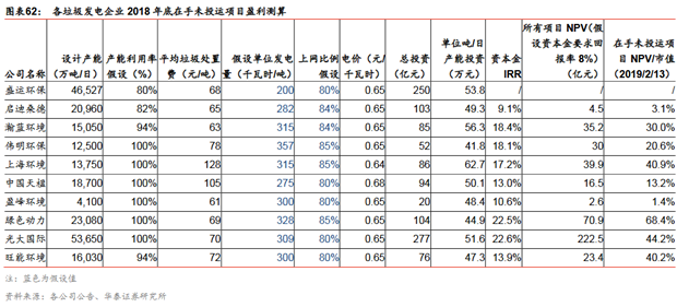 典型項目的NPV考慮項目融資結(jié)構(gòu)的項目NPV測算:我們假設(shè)項目的資本結(jié)構(gòu)為70%債務(wù),30%自有資金,參考中國天楹/綠色動力的公司財務(wù)狀況,假設(shè)其項目的債務(wù)資金的綜合成本分別為6.5%/5.6%,各個項目每年將新增部分財務(wù)費(fèi)用。依據(jù)之前的投資數(shù)據(jù)和現(xiàn)金流數(shù)據(jù),我們計算得到各個項目考慮融資杠桿后的NPV,其中最高的為康恒寧波項目,其NPV為6.8億元,主要是因?yàn)槠鋰嵗幹觅M(fèi)高于其他所有項目,并且噸垃圾發(fā)電量也處于相對較高水平;而天楹延吉項目、康恒廣水項目、綠色動力海寧、綠色動力永嘉項目一期的NPV均較低,分別為1.08億元、1.01億元、1.31億元、0.97億元,主要因?yàn)榍皟蓚€項目的噸垃圾處置費(fèi)和噸垃圾發(fā)電量均較低,而后兩個項目的噸垃圾處置費(fèi)較低。我們再次計算了各項目的單位產(chǎn)能NPV,發(fā)現(xiàn)天楹延吉項目、康恒廣水項目、綠色動力永嘉項目一期的該指標(biāo)分別僅有13.56萬元/噸、16.89萬元/噸、19.48萬元/噸,而康恒寧波項目、綠色動力永嘉項目二期、綠色動力海寧項目則分別達(dá)到30.24萬元/噸、28.83萬元/噸、26.14萬元/噸,再一次反映了后三個項目相對更高的噸垃圾處置費(fèi)和噸垃圾發(fā)電量所帶來的更高的項目價值。根據(jù)我們的敏感性分析,假設(shè)垃圾處置費(fèi)增加5元/噸,各個垃圾發(fā)電項目的NPV增加410-2809萬元;噸垃圾發(fā)電增加20千瓦時/噸,各個項目的NPV增加區(qū)間為611-4830萬元。我們考慮融資成本和WACC兩個指標(biāo)再次對各個項目的NPV進(jìn)行敏感性分析,發(fā)現(xiàn)融資成本增加0.3pct時, 各個項目的NPV降低322萬元-2120萬元;WACC增加0.5pct時,各個項目的NPV降低789萬元-5033萬元。