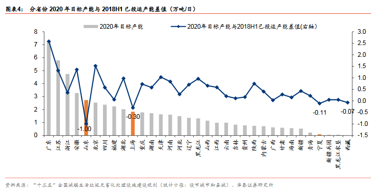 產(chǎn)能加速釋放:17年城市新增4.2萬噸/日(2012-2016年均新增3.2萬噸/日);17縣城投運速度提速,我們估計17新增3.2萬噸/日(十二五年均新增0.4萬噸/日)。按照選取典型上市公司(18年已投運產(chǎn)能市占率29%)投產(chǎn)規(guī)劃,18-20年累計投運增速24%/24%/33% vs 按照十三五規(guī)劃測算18-20年累計投運產(chǎn)能增速23%/19%/16%,上市公司投產(chǎn)增速高于行業(yè)增速,表明1)行業(yè)增速可能超預(yù)期或 ;2)上市公司已投運市占率將提升。分區(qū)域:山東/上海/寧夏等省市提前完成十三五目標(biāo),廣東/北京/安徽/江蘇等19-20年仍具較大空間,中西部新增投運崛起,東部部分地區(qū)仍有空間。