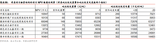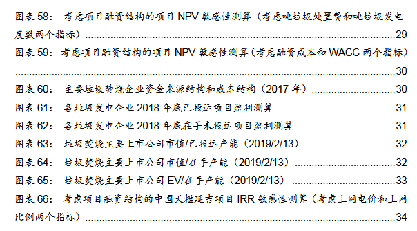 典型項目的NPV考慮項目融資結(jié)構(gòu)的項目NPV測算:我們假設(shè)項目的資本結(jié)構(gòu)為70%債務(wù),30%自有資金,參考中國天楹/綠色動力的公司財務(wù)狀況,假設(shè)其項目的債務(wù)資金的綜合成本分別為6.5%/5.6%,各個項目每年將新增部分財務(wù)費用。依據(jù)之前的投資數(shù)據(jù)和現(xiàn)金流數(shù)據(jù),我們計算得到各個項目考慮融資杠桿后的NPV,其中最高的為康恒寧波項目,其NPV為6.8億元,主要是因為其噸垃圾處置費高于其他所有項目,并且噸垃圾發(fā)電量也處于相對較高水平;而天楹延吉項目、康恒廣水項目、綠色動力海寧、綠色動力永嘉項目一期的NPV均較低,分別為1.08億元、1.01億元、1.31億元、0.97億元,主要因為前兩個項目的噸垃圾處置費和噸垃圾發(fā)電量均較低,而后兩個項目的噸垃圾處置費較低。我們再次計算了各項目的單位產(chǎn)能NPV,發(fā)現(xiàn)天楹延吉項目、康恒廣水項目、綠色動力永嘉項目一期的該指標(biāo)分別僅有13.56萬元/噸、16.89萬元/噸、19.48萬元/噸,而康恒寧波項目、綠色動力永嘉項目二期、綠色動力海寧項目則分別達(dá)到30.24萬元/噸、28.83萬元/噸、26.14萬元/噸,再一次反映了后三個項目相對更高的噸垃圾處置費和噸垃圾發(fā)電量所帶來的更高的項目價值。根據(jù)我們的敏感性分析,假設(shè)垃圾處置費增加5元/噸,各個垃圾發(fā)電項目的NPV增加410-2809萬元;噸垃圾發(fā)電增加20千瓦時/噸,各個項目的NPV增加區(qū)間為611-4830萬元。我們考慮融資成本和WACC兩個指標(biāo)再次對各個項目的NPV進(jìn)行敏感性分析,發(fā)現(xiàn)融資成本增加0.3pct時, 各個項目的NPV降低322萬元-2120萬元;WACC增加0.5pct時,各個項目的NPV降低789萬元-5033萬元。