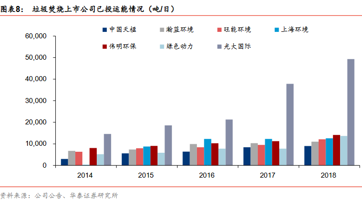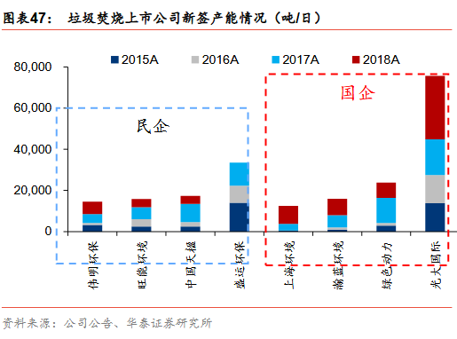新增訂單趨勢:國企拿單能力強(qiáng)于民企。我們對光大國際、綠色動力、瀚藍(lán)環(huán)境、上海環(huán)境、盛運環(huán)保、中國天楹、旺能環(huán)境、偉明環(huán)保幾家典型垃圾發(fā)電上市公司2015-2018年新簽訂單進(jìn)行分析,其中光大國際、綠色動力、瀚藍(lán)環(huán)境、上海環(huán)境四家國企2015年新簽訂單1.8萬噸/日,占8家上市公司新簽訂單總產(chǎn)能的45%,2016年提升至52%、2017年繼續(xù)提升至56%,2018年四家國企新簽訂單總產(chǎn)能為5.5萬噸/日,占比提升至80%,國企拿單能力顯著強(qiáng)于民企。