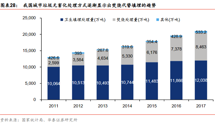 驅(qū)動因素二:土地有限,鄰避效應(yīng)減弱驅(qū)使填埋轉(zhuǎn)焚燒在我國,垃圾焚燒相比于填埋方式優(yōu)勢顯著,更受政策鼓勵。我國主要垃圾處理方式有衛(wèi)生填埋、焚燒發(fā)電和堆肥等三種方式。衛(wèi)生填埋是目前我國城市垃圾處理的主導(dǎo)方式,但存在二次污染隱患;堆肥方式在我國已逐漸退出,具有項目建設(shè)成本高、效益低、存在重金屬污染等問題,處理規(guī)模受到限制;相比之下,垃圾焚燒方式不僅污染控制標(biāo)準(zhǔn)已與國際標(biāo)準(zhǔn)(GB標(biāo)準(zhǔn))接軌,經(jīng)濟(jì)效益也遠(yuǎn)優(yōu)于衛(wèi)生填埋,具有盈利模式清晰,市場化程度高,可持續(xù)等優(yōu)勢,因此具有較大發(fā)展空間。根據(jù)國家統(tǒng)計局統(tǒng)計數(shù)據(jù),“十二五”期間我國垃圾焚燒處理能力增長了149.7%?!笆濉蹦├贌幚砹空祭鵁o害化處理量34%,復(fù)合增速為22%,衛(wèi)生填埋處理量垃圾無害化處理64%,復(fù)合增速為4%,“十二五”期間垃圾焚燒處理量增速顯著高于衛(wèi)生填埋處理量增速。