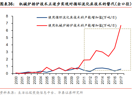 國際上機(jī)械爐排爐技術(shù)已經(jīng)非常成熟并且被廣泛使用,相比循環(huán)流化床技術(shù),機(jī)械爐排爐技術(shù)擁有單臺焚燒爐的垃圾處理量大、進(jìn)料垃圾不需要進(jìn)行預(yù)處理、對垃圾的成分要求低、污染物排放和灰渣熱灼減率等指標(biāo)更易達(dá)標(biāo)、燃燒狀態(tài)穩(wěn)定、運行成本低、年運行時間長、操作簡便等優(yōu)勢。而國內(nèi)2012年發(fā)布的《國家發(fā)展改革委關(guān)于完善垃圾焚燒發(fā)電價格政策的通知》和2014年發(fā)布的《生活垃圾焚燒污染控制標(biāo)準(zhǔn)》等政策也使得循環(huán)流化床技術(shù)的運行成本增加,因而近年來機(jī)械爐排爐技術(shù)正在逐步實現(xiàn)對循環(huán)流化床技術(shù)的替代。