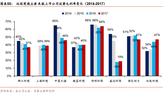 上市公司會計政策差異:垃圾焚燒會計處理方法各不相同。下面我們選取了行業(yè)里一些主要的上市公司分析,匯總?cè)缦卤?,其中:BOT計入工程收入的主要有錦江環(huán)境、光大國際、上海環(huán)境、瀚藍(lán)環(huán)境、盛運環(huán)保、綠色動力;BOT計入設(shè)備銷售收入的主要有:光大國際、中國天楹、偉明環(huán)保、盛運環(huán)保,其中偉明環(huán)保的設(shè)備銷售的毛利率較高,大約在46%左右;各公司的運營毛利率有一定差異,大部分公司2016年毛利率出現(xiàn)了同比下滑,預(yù)計由于新投運項目的盈利能力不如老項目所致。其中偉明環(huán)保垃圾發(fā)電項目毛利率高出行業(yè)平均較多,主要是因為設(shè)備折舊費用少,設(shè)備折舊費用可以占到垃圾焚燒成本的40%-50%,而偉明環(huán)保的設(shè)備折舊較少主要有兩點原因:1)偉明環(huán)保自產(chǎn)爐排爐設(shè)備,同時不計設(shè)備銷售收入,因此在在建工程確認(rèn)時并不包含設(shè)備毛利(一般設(shè)備毛利率約40%),因此最終轉(zhuǎn)入無形資產(chǎn)特許經(jīng)營權(quán)的金額比其他公司大約節(jié)省了40%的設(shè)備投資;2)偉明環(huán)保采取的折舊方法是按照特許經(jīng)營權(quán)年限折舊,按照2016年特許經(jīng)營權(quán)折舊的數(shù)據(jù)估計,綜合折舊年限在25年,折舊年限長于啟迪桑德、瀚藍(lán)環(huán)境、中國天楹、光大國際(這些公司采取特許經(jīng)營權(quán)和資產(chǎn)使用年限孰短的方法折舊,一般綜合折舊年限為20年)。