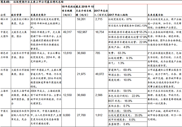 競爭格局:集中度較高,國企競爭力增強(qiáng)根據(jù)2018年10月的垃圾焚燒項目在手規(guī)模排序,目前垃圾焚燒行業(yè)主要的參與者包括:1)國企:光大國際、中國環(huán)境保護(hù)集團(tuán)、綠色動力環(huán)保、皖能環(huán)保、康恒環(huán)境、北京控股、重慶三峰、上海環(huán)境、啟迪桑德、廣州環(huán)保、瀚藍(lán)環(huán)境等;2)民企:錦江環(huán)境、盛運環(huán)保、中國