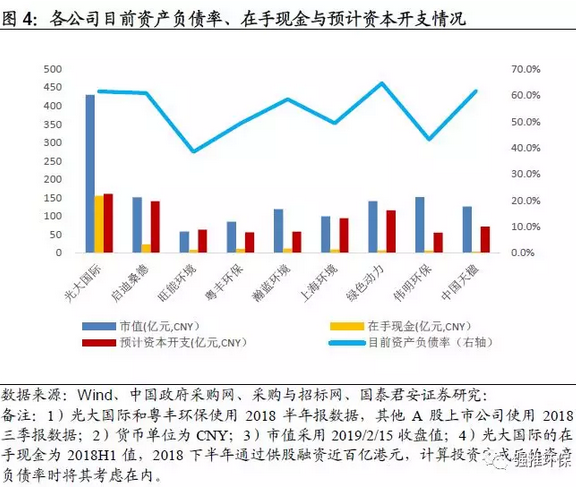 我們測算,存量項目達產后,9家垃圾焚燒重點上市公司平均資產負債率提升至66%。1)目前主要垃圾焚燒上市公司資產負債率平均為54%,在手現(xiàn)金與市值之比平均為12%。2)預計的資本開支完成之后,各公司的平均資產負債率將提升為66%。3)光大國際:考慮到供股募資,在預計資本開支都完成后,資產負債率將由2018H1的61%降低到46%,這主要是由于2018下半年公司進行了大規(guī)模的供股募資百億港元,在手現(xiàn)金充沛。強大的融資能力也是公司的核心競爭力之一,為項目落地提供充分支持。4)綠色動力、中國天楹:在預計資本開支都完成后,資產負債率將達到較高水平,這意味著公司或將采用其他融資方式或放緩某些新項目資金投入的節(jié)奏。5)旺能環(huán)境、偉明環(huán)保等其他6家公司:在預計資本開支都完成后,資產負債率將在65%左右水平,后續(xù)隨著項目進入運營期現(xiàn)金回流貸款償還,資產負債率水平將逐步下降。
