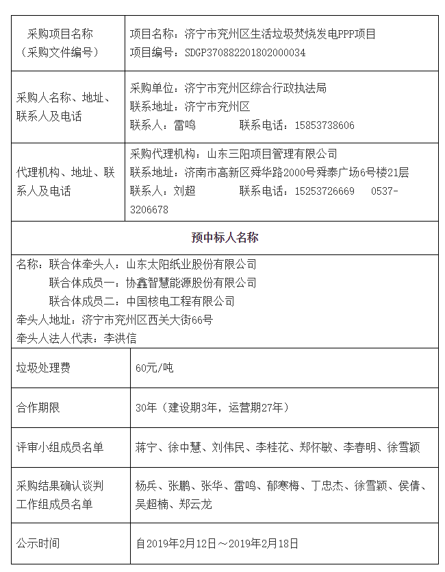 2019年春節(jié)過后,開工的第二天,2月12日,從濟寧公共資源交易網獲悉,山東濟寧市兗州區(qū)生活垃圾焚燒發(fā)電PPP項目預中標結果公示,山東太陽紙業(yè)股份有限公司牽頭的,協(xié)鑫智慧能源股份有限公司與中國核電工程有限公司組成的聯合體中標,垃圾處理費60元/噸。