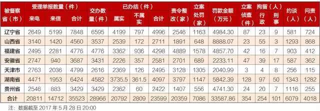 4月28日至5月28日,第三批7個中央環(huán)境保護(hù)督察組共計受理舉報35523個,經(jīng)梳理分析并合并重復(fù)舉報,累計向被督察地方交辦有效舉報28966件。地方已辦結(jié)23599件,責(zé)令整改20359家,立案處罰7086家,共計罰款33587.86萬元;立案偵查354件,行政和刑事拘留355人,約談6079人,問責(zé)4018人。