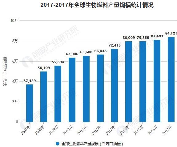 隨著全球大規(guī)模、大范圍的發(fā)展生物質(zhì)能發(fā)電,生物燃料生物燃料產(chǎn)量規(guī)模也實(shí)現(xiàn)的迅速的增長。數(shù)據(jù)顯示,2007年全球生物燃料產(chǎn)量為3742.9萬噸當(dāng)油量,至2017年上升至8412.1萬噸當(dāng)油量,2008-2017年復(fù)合增長率達(dá)8.43%。