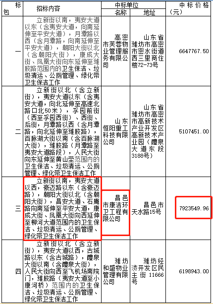 山東濰坊高密市2019-2021年度城區(qū)環(huán)衛(wèi)作業(yè)項(xiàng)目發(fā)布中標(biāo)公告,昌邑市康潔環(huán)衛(wèi)工程有限公司獲得三標(biāo)段,中標(biāo)金額792萬(wàn)。