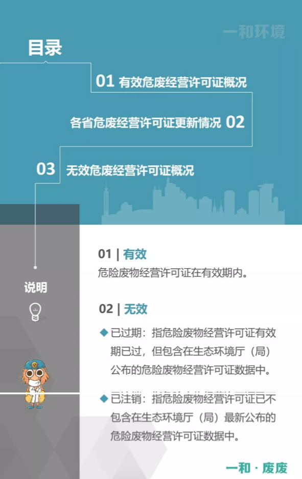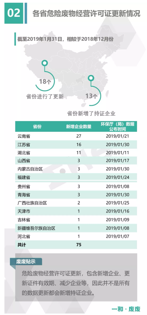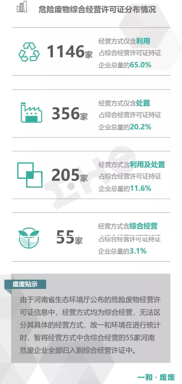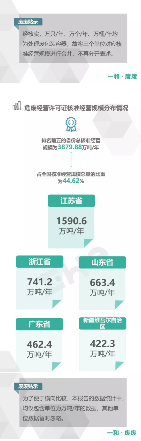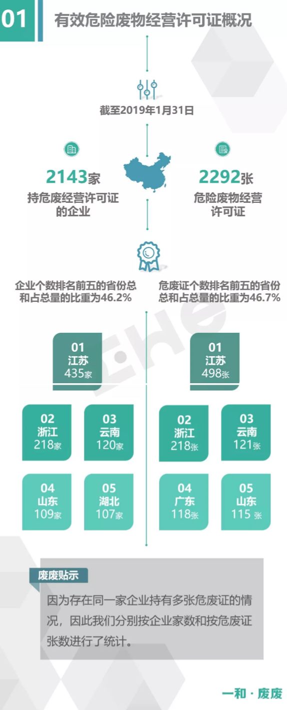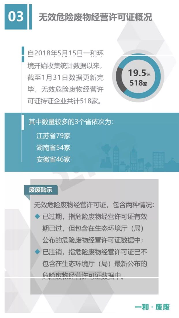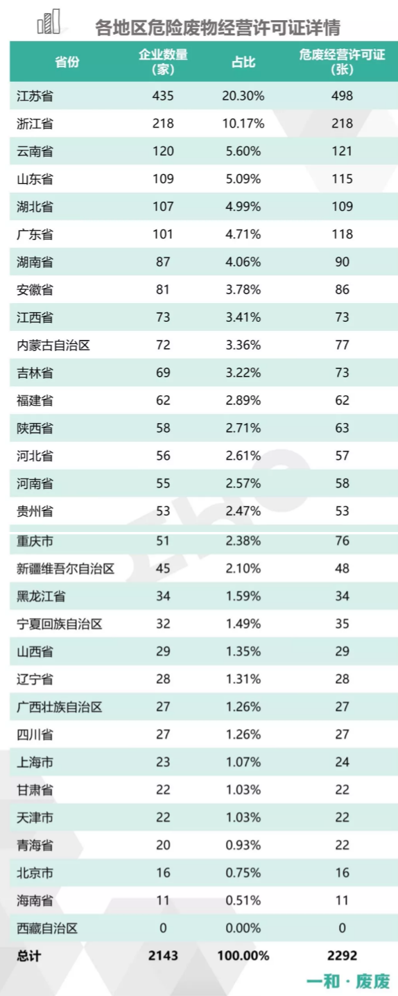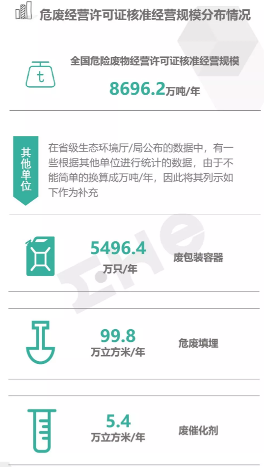 2.統(tǒng)計范圍:本次數(shù)據(jù)收集統(tǒng)計的范圍為省級生態(tài)環(huán)境廳(局)官方公布的持有危險廢物經(jīng)營許可證企業(yè)的數(shù)據(jù),因此由地級市發(fā)布的醫(yī)療廢物經(jīng)營許可證、收集經(jīng)營許可證,且未納入省級生態(tài)環(huán)境廳(局)公布數(shù)據(jù)的部分,并未計入統(tǒng)計數(shù)據(jù)中。