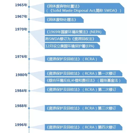 從70年代起,美國(guó)以《國(guó)家環(huán)境政策法》為基礎(chǔ),成立了國(guó)家環(huán)境保護(hù)署,制定了《固體廢物處理法》、《資源保護(hù)與回收利用法》、《危險(xiǎn)廢物管理?xiàng)l例》、《綜合環(huán)境反應(yīng),補(bǔ)償和責(zé)任法》等諸多法律,經(jīng)過(guò)多年的發(fā)展,美國(guó)環(huán)衛(wèi)行業(yè)相關(guān)法律體系已經(jīng)非常完善。其發(fā)展脈絡(luò)如下圖所示: