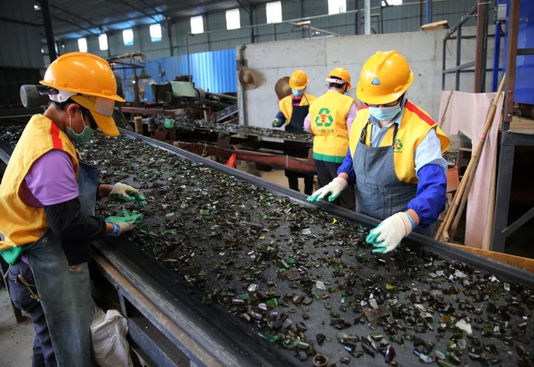 △白云區(qū)玻璃回收處理中心:回收的廢棄玻璃制品通過機器進行破碎清洗后,工作人員在進行精細分揀工序,將金屬蓋、塑料蓋徹底分離出來